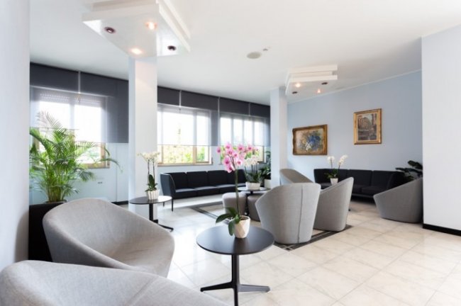 Sala d'attesa moderna con poltrone e piante.