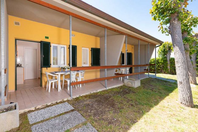 Struttura in muratura di 25mq composta da: camera matrimoniale con armadio, cameretta con due letti singoli, soggiorno, angolo cottura, servizi igienici. Veranda esterna attrezzata con tavolo e sedie. A richiesta è disponibile da 5 posti, con letto a castello più un letto singolo nella cameretta.