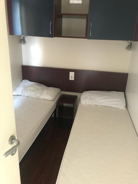 Dispone di una camera con 2 letti singoli, una camera con letto alla francese, angolo cottura, frigorifero, bagno con doccia e veranda esterna coperta, attrezzata con tavolo e sedie. Possibilità di sostituire un letto singolo con una culla. Su richiesta casa mobile con aria condizionata.