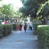 Area ombreggiata in un parco con alberi, cespugli e tettoie.