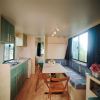 Interno di una casa mobile con cucina, tavolo, divano e finestre luminose.