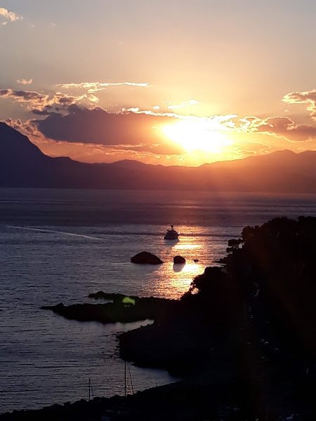Tramonto sul mare con un'imbarcazione e montagne in lontananza, cielo arancione e nuvole.