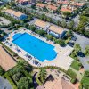 Vista aerea su un complesso turistico con piscina e anfiteatro vicino al mare.