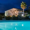 Piscina illuminata di notte circondata da palme e ombrelloni.