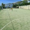Un campo da calcetto all'aperto con rete di protezione, persona che calcia la palla.