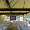 Sedie di plastica e palco teatrale all'aperto.