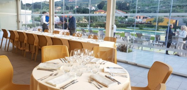Tavola rotonda apparecchiata accanto a una lunga tavolata.