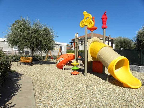 Parco giochi con scivolo giallo e seduta su ghiaia.