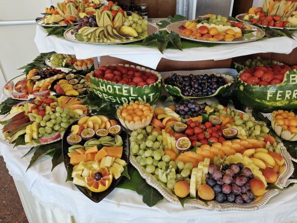 Sala da pranzo con tavoli apparecchiati e buffet di frutta sulla sinistra.
