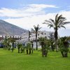Edificio bianco con arcate, palme e prato verde, montagne sullo sfondo.