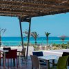Tavoli e sedie colorate sotto un pergolato con vista sul mare e palme.
