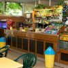 Interno di un bar con tavoli, sedie verdi e un bancone fornito di bevande e snack.