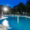 Una piscina illuminata di notte, circondata da lettini e alberi.