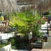 Tavoli e sedie di legno sotto ombrelloni di paglia in un'area esterna con piante tropicali.
