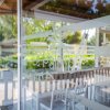 Tavoli e sedie bianche sotto una tenda, con vista su una piscina e giardino fiorito.