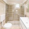 Un bagno con doccia con porte in vetro, lavabo moderno e wc sospeso.