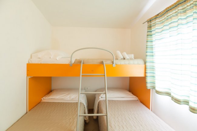 massimo 6 posti letto, trilocale di 25 mq con soggiorno con angolo cottura, camera da letto matrioniale, camera con 2 letti singoli e bagno con doccia, veranda attrezzata.